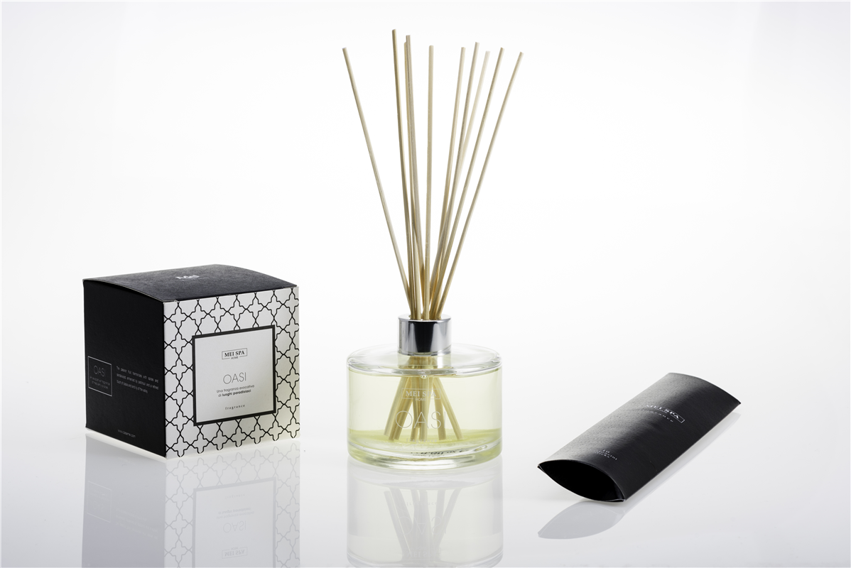 Raumduft Oasi in Glasflasche mit Holzstbchen, exotischer Duft von paradiesischen Orten