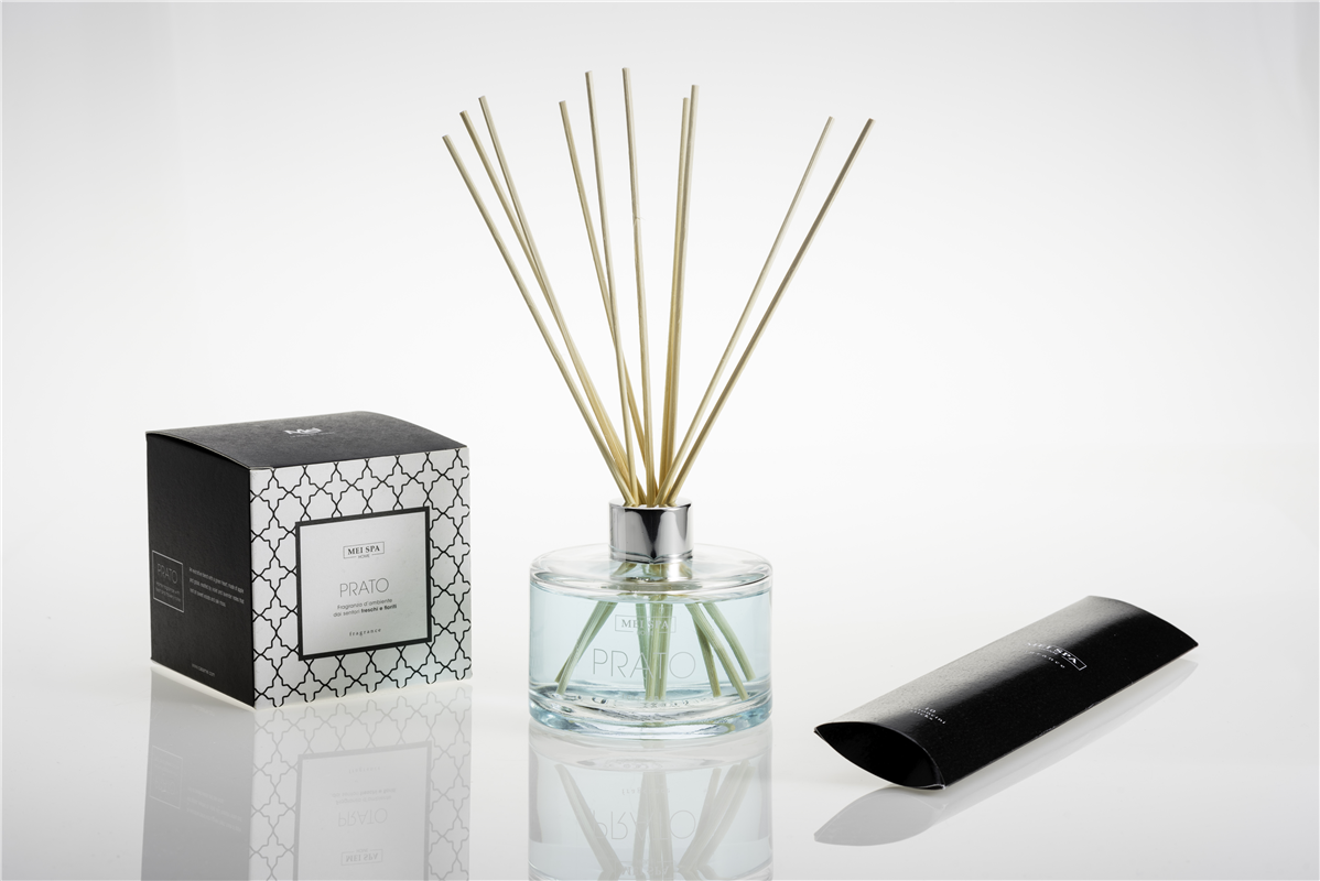 Raumduft Prato in Glasflasche mit Holzstäbchen, frische und blumige Note